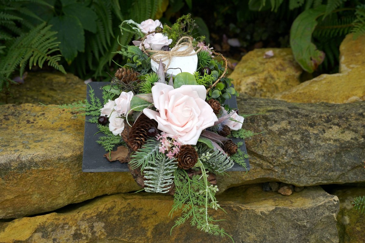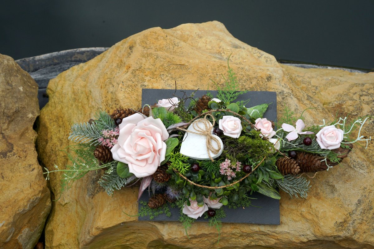 Dlouhá dekorace na hrob umístěná na břidlicové podložce. Rozměr dekorace je 53x24x10cm.