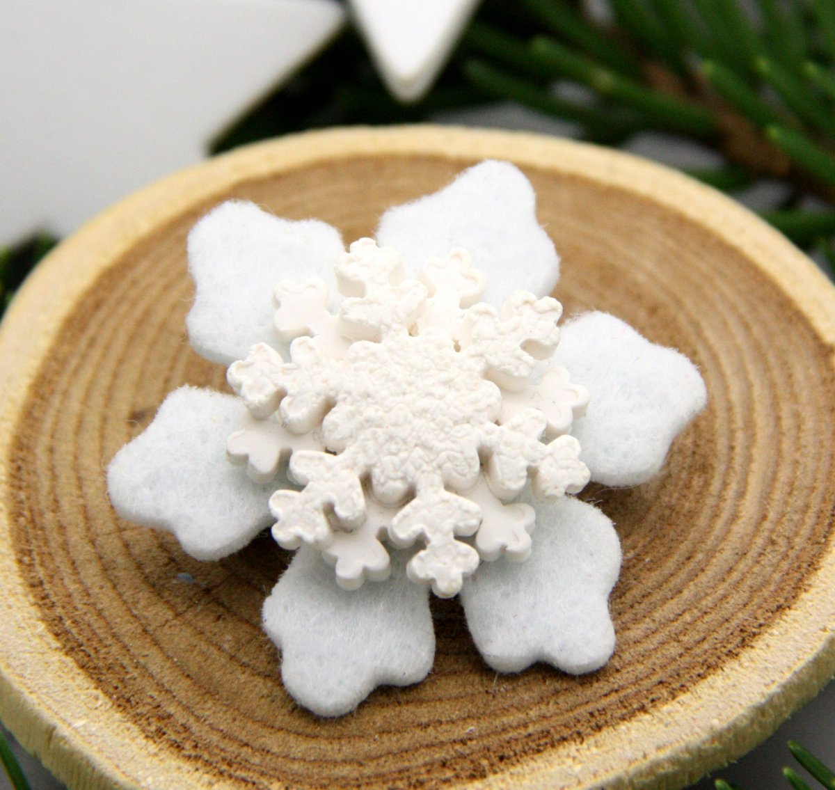 šperk z polymerové hmoty a filcu, v podobě vrstvené zimní vločky,