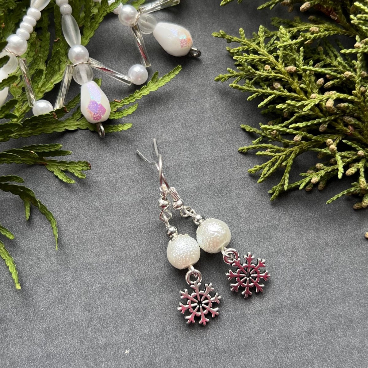 Drobné náušnice s bílými skleněnými korálkami a stříbrnou vločkou. Délka od háčku 3 cm, gumové zarážky. Komponenty v barvě stříbra - běžný kov