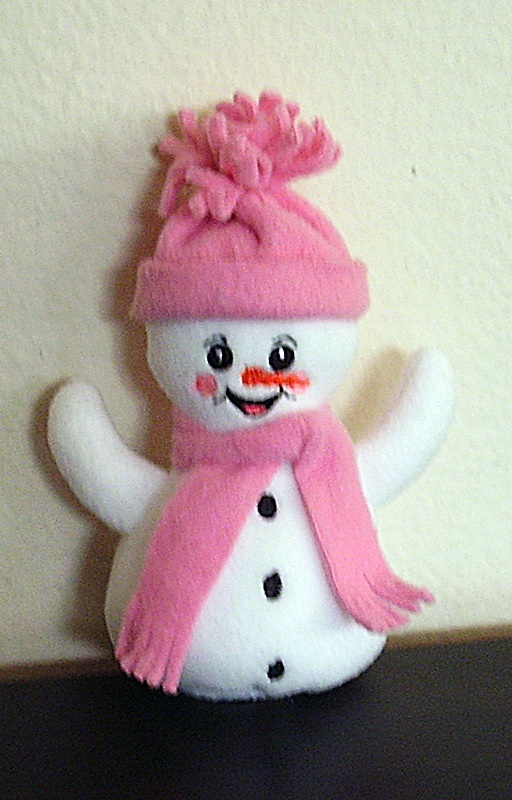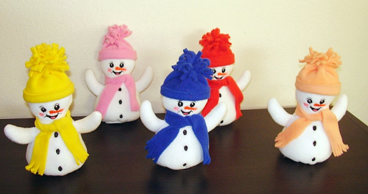 Roztomilí sněhuláčci z fleece, náplň duté vlákno-kuličky. Výška 18cm. Čepičky a šály v barvě : růžové, červené, tm. modré , sv. modré, oranžové, žluté.