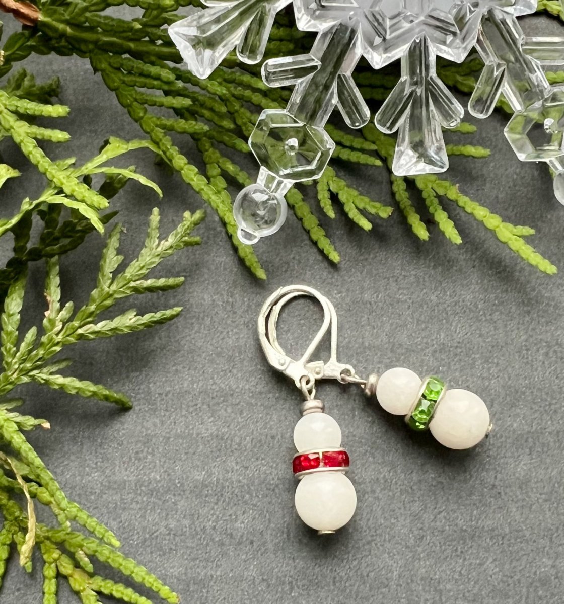 Drobné náušnice s bílými jadeitovými kuličkami a štrasovou rondelkou - jedna náušnice s červenou a druhá se zelenou. Délka od háčku 2 cm, celková délka 3 cm - uzavíratelný háček. Komponenty v barvě stříbra - běžný kov