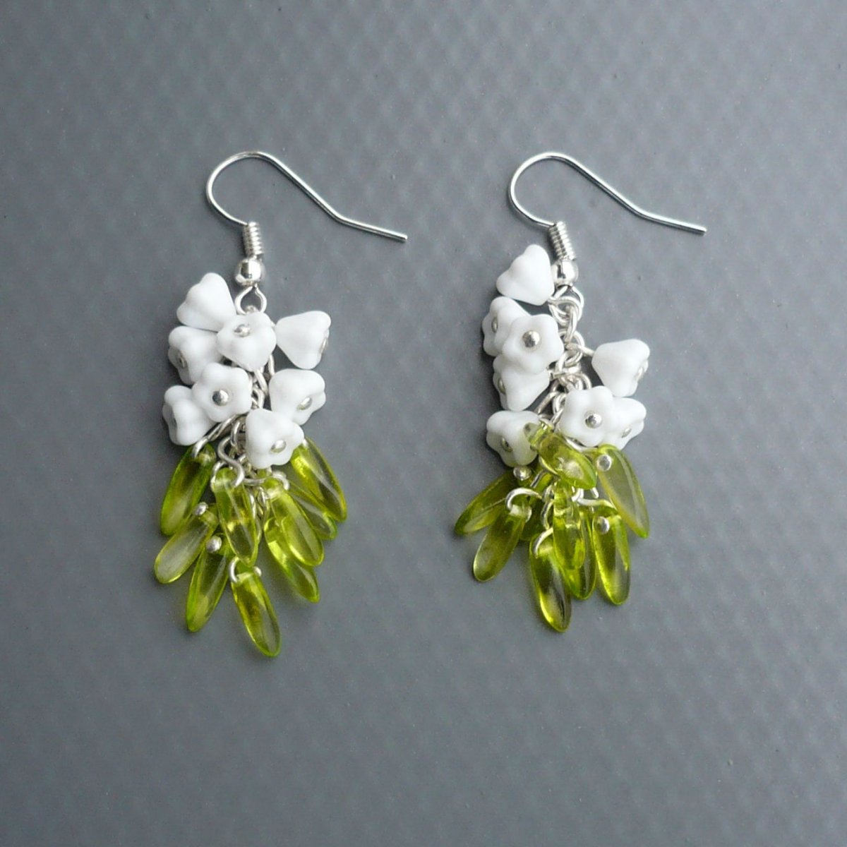 Náušnice jsou tvořeny z bílých skleněných korálků v podobě kvítků a světle zelených průhledných drobných jazýčků. Korálky jsou uspořádané do hrozínku.