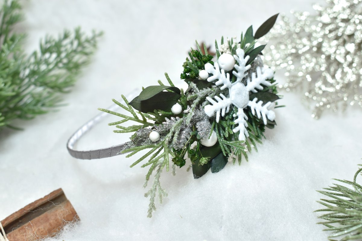 Kovová čelenka potažená stříbrnou stuhou je ozdobena měkkou vločkou, plastovými jehličnany, sušenými lístky a bobulkami a stříbrnými větvičkami.
