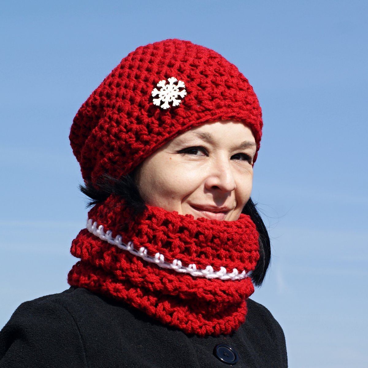 Zimný háčkovaný set vo výraznej červenej farbe.