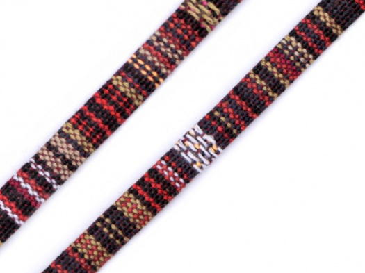 Pevná plochá šňůra s indiánským vzorem má šíři 7 mm. Šňůra je vhodná do tunýlků mikin, kalhot, apod. Uvedená cena je za 1 metr.