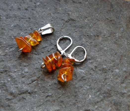 Krásná, jednoduchá souprava z medově jantarových kousků a nerezu.
