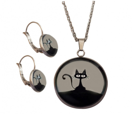 Skleněný kabošon v ocelovém lůžku o průměru 30 mm, ocelový řetízek dlouhý 50 cm a ocelové náušnice s francouzským zapínáním, velikost 12 mm.