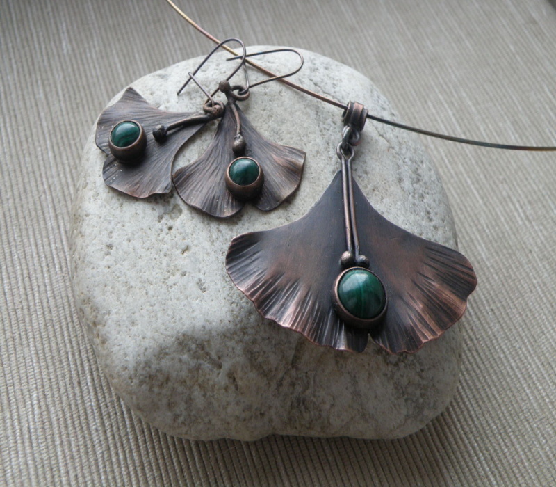 K tomu měděný přívěsek jinanu dvoulaločného , uvnitř je také malachit vel 10 mm, v ozdobném pouzdře. Výška přívěsku je 6 cm, šíře 6 cm.Zavěšeno na patinované nerezové obruči ,možno vyměnit za kulatou černou kůži s měděným uzávěrem.