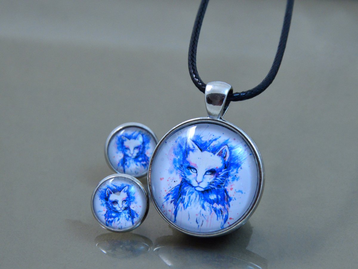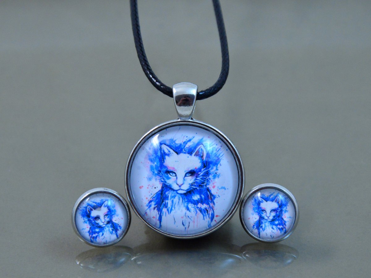 Ručně tvořená sada náušnic a náhrdelníku se skleněnými čočkami s motivem. Puzetové náušnice mají vnitřní průměr 12 mm a přívěsek 25 mm. Přívěsek je zavěšen na černé kožené šňůrce o délce 45 cm s prodlužovacím řetízkem (5 cm) a se zapínáním na karabinku. Součástí puzetek je i kovová zarážka.