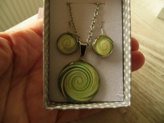 souprava náhrdelník - nerez lůžko,25mm fotomotiv, zalito prysykřicí,náušnice 10-12mm puzetky,zarážka, řetízek z chir.oceli 70cm.