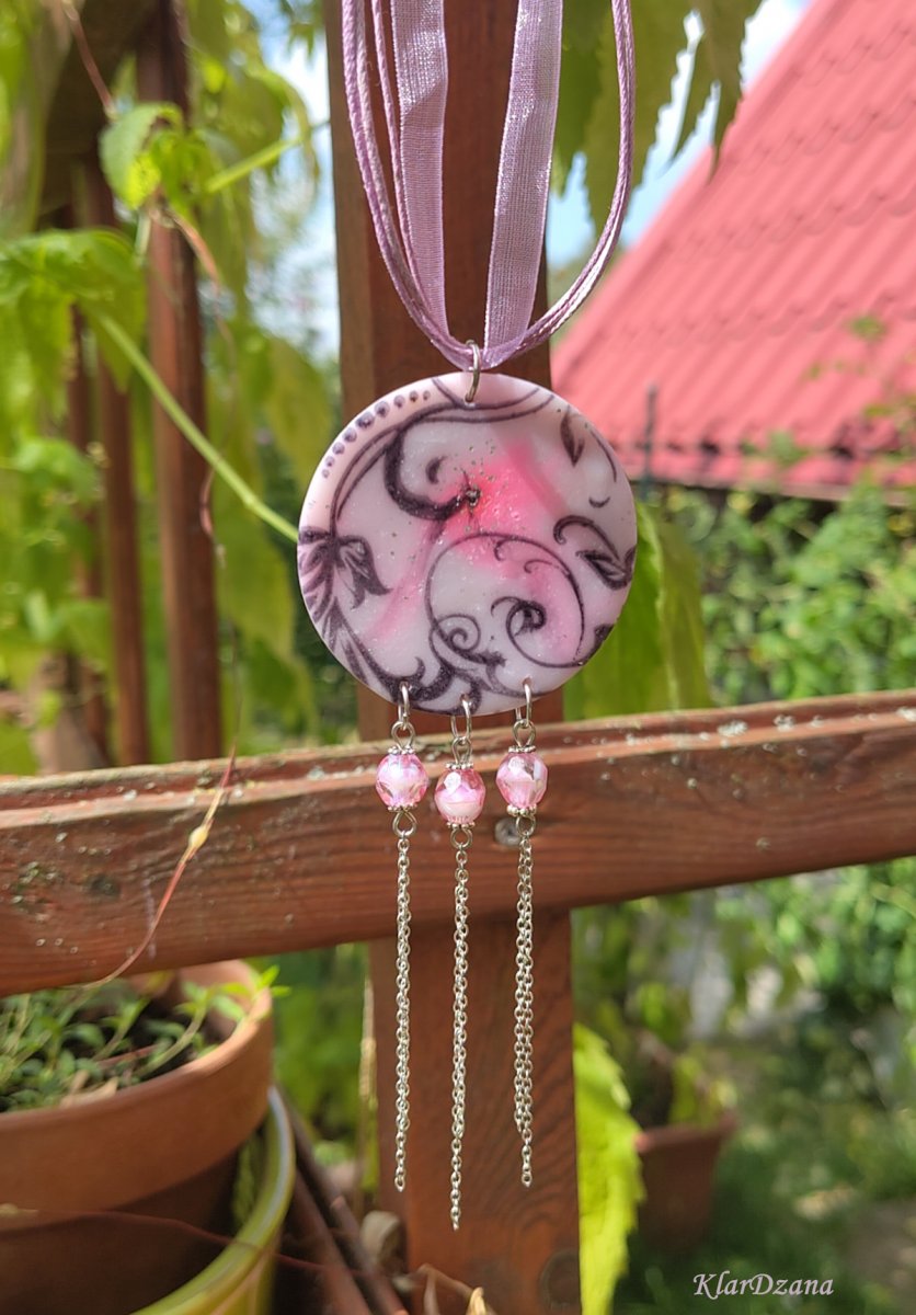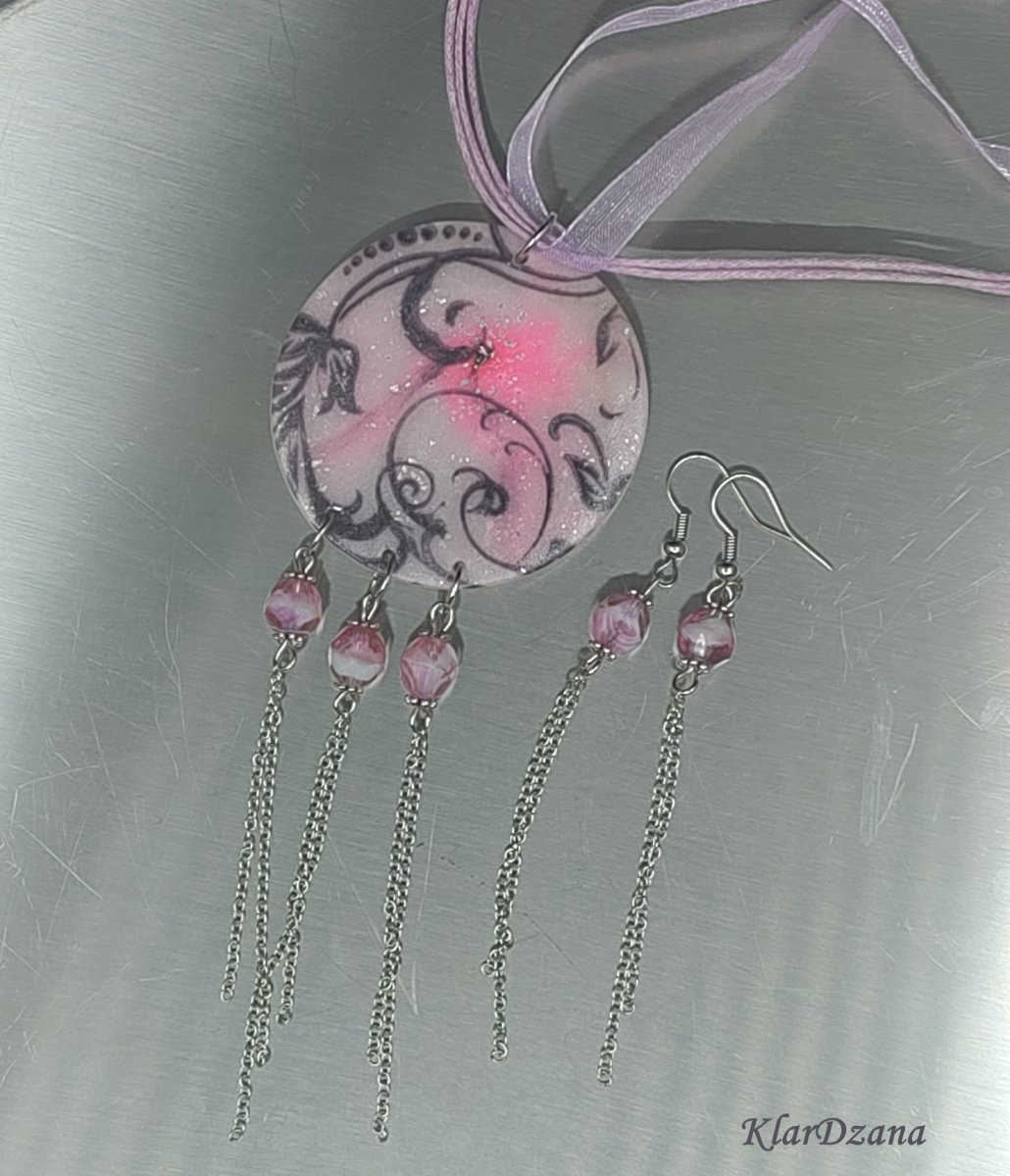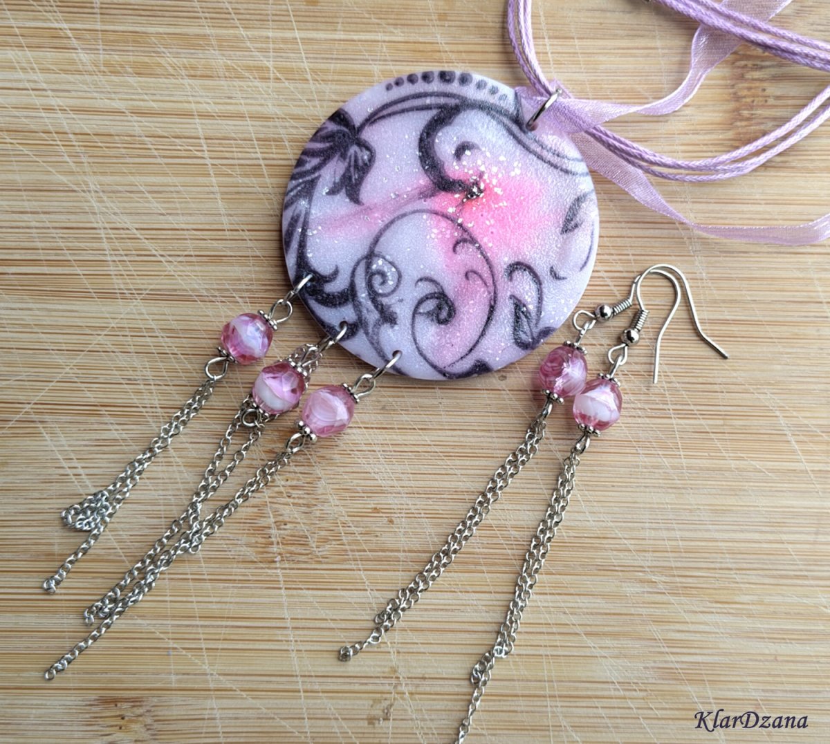 Romantický set náhrdelníku a náušnic z polymeru, skleněných korálků a drobných řetízků v růžové barvě