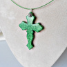 Na zeleném lanku je zavěšen kříž z minerálu howlit, o velikosti 8 x 5 cm.