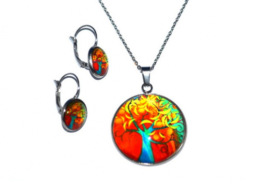 Skleněný kabošon v ocelovém lůžku o průměru 30 mm, ocelový řetízek dlouhý 60 cm a ocelové náušnice s francouzským zapínáním, velikost 12 mm.