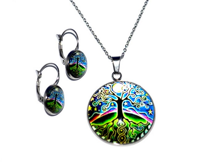 Skleněný kabošon v ocelovém lůžku o průměru 30 mm, ocelový řetízek dlouhý 50 cm a ocelové naušnice s francouzkým zapínáním, velikost 12 mm.