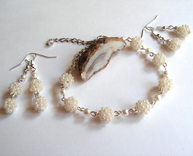 Jemná souprava náramku a náušnic z kuliček ušitých z rokajlu a voskovaných perlí, v soupravě jsou dvoje náušnice - dlouhé - 3,4 cm a krátké - 1,5 cm. Délka náramku je 18 cm + 5 cm prodlužovací řetízek.