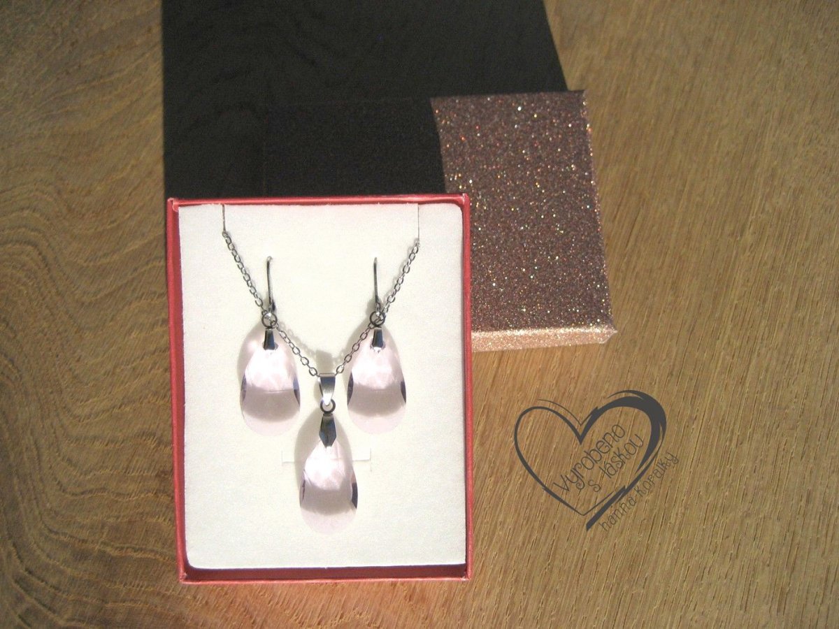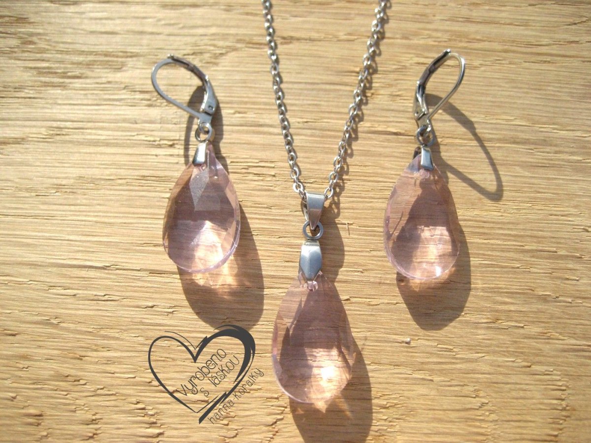 Jednoduchá a zároveň velmi elegantní sada z nerez oceli - řetízek 45cm a visací náušnice s uzavíratelným háčkem - přívěsek kapka 2,6x1,8 cm, přívěsky jsou z broušeného skla v růžové čiré barvě, součástí sady je dárková krabička