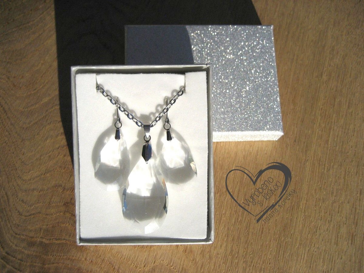 Elegantní, jednoduchá a zároveň výrazná sada z nerez oceli - pevný řetízek 55cm s velkým přívěskem 5x2,3 cm a visací náušnice s uzavíratelným háčkem a kapkou 3,3x1,7 cm, přívěsky jsou z broušeného skla v bílé čiré barvě, součástí sady je dárková krabička