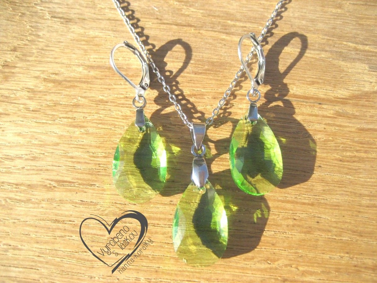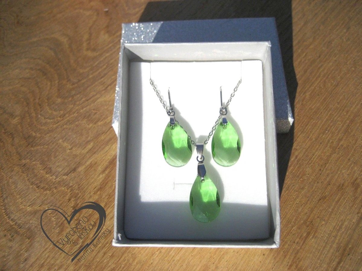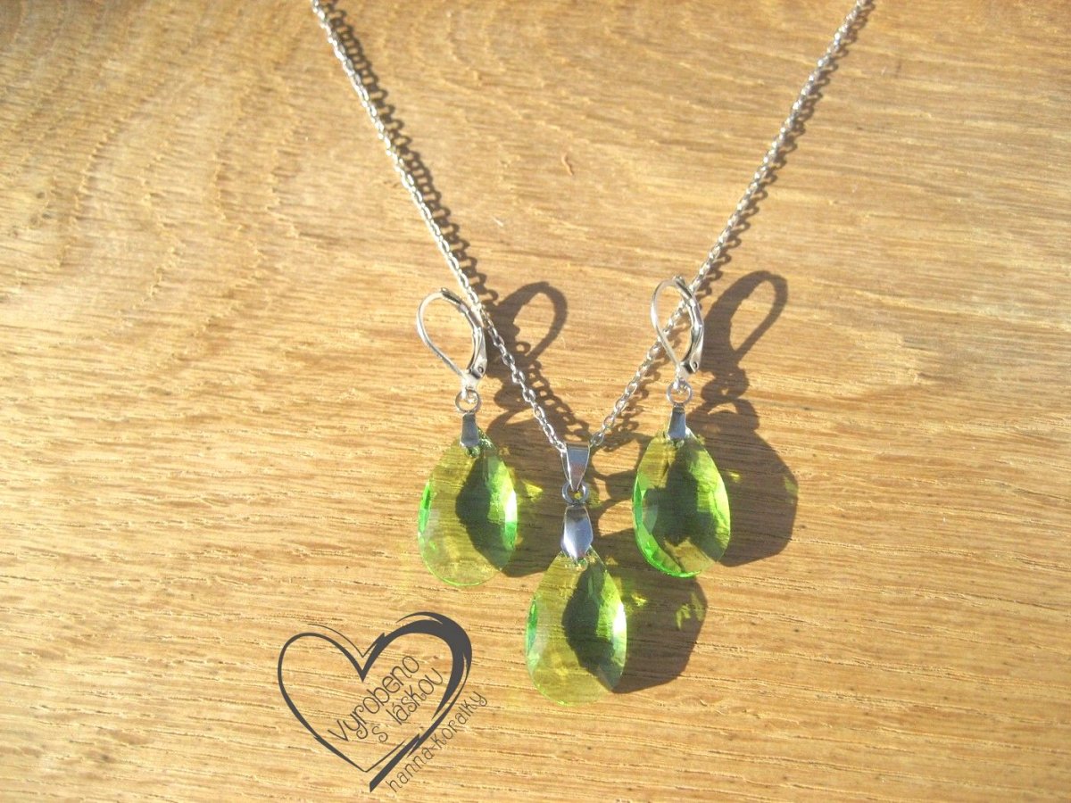 Jednoduchá a zároveň velmi elegantní sada z nerez oceli - řetízek 45cm s přívěskem 3,3x1,7 cm a visací náušnice s uzavíratelným háčkem a kapkou 2,6x1,8 cm, přívěsky jsou z broušeného skla v zelené čiré barvě, součástí sady je dárková krabička
