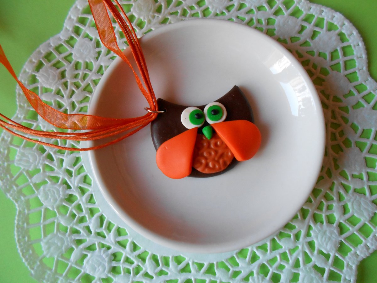 Šperk o velikosti 4x2,5 cm na bavlněné oranžované šňůrce o délce 44 cm.