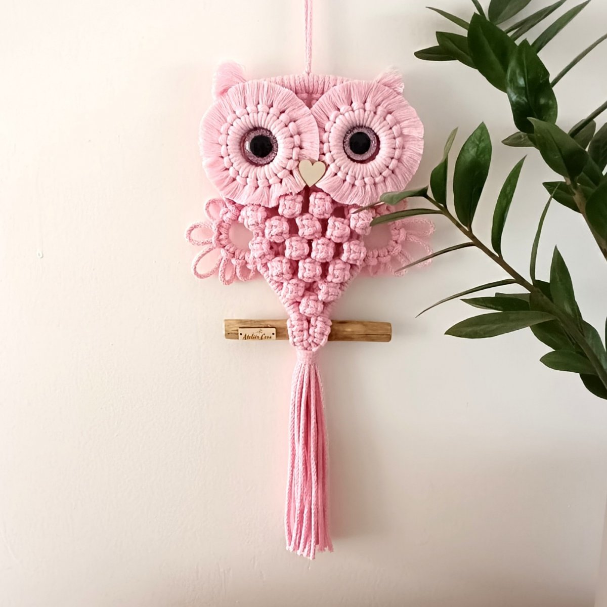 Sovička na větvi růžová s růžovýma očima