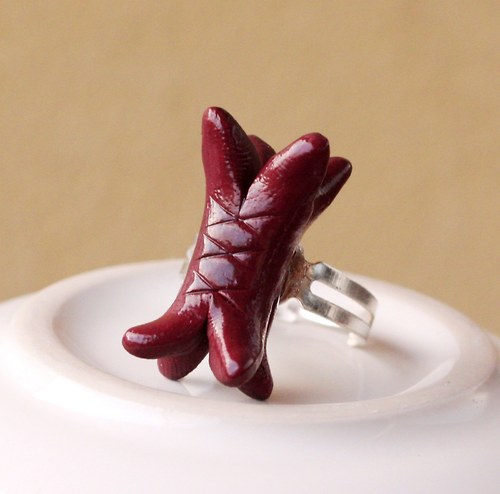 ručně modelovaný šperk z polymerové hmoty, výška 2,4 cm, špekáček je připevněn na prstýnek schválně mírně nakřivo, přišlo mi to vyvážené a zajímavé :-), mám i v rovném provedení