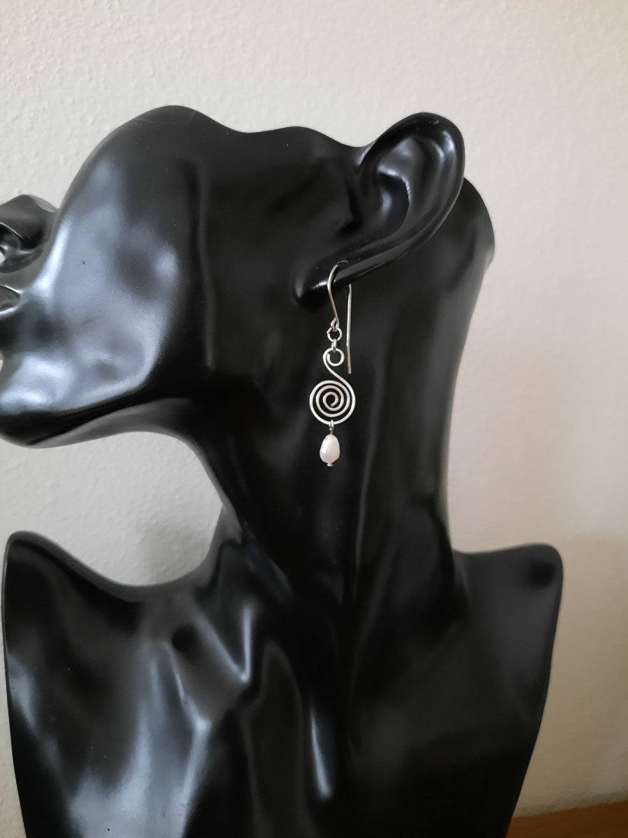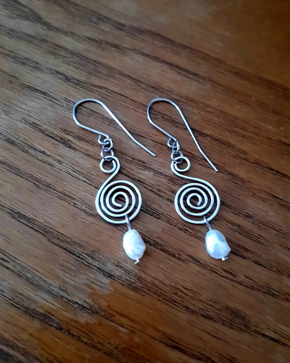 Náušnice s krásnými bílými říčními perlami jsou ručně tepané z leštěné chirurgické oceli .
