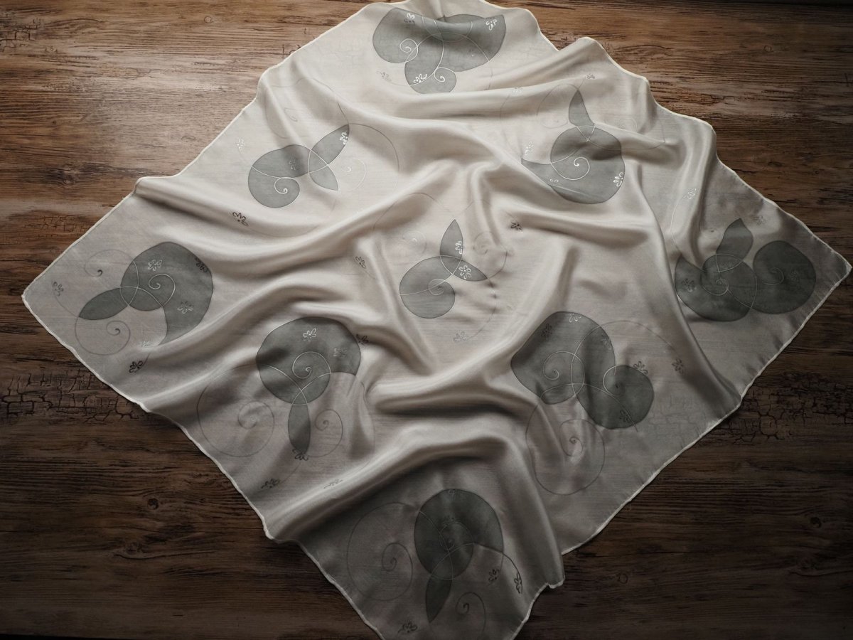 Ručně malovaný šátek z přírodního hedvábí (pongé 5). Použití kvalitních barev a tepelné fixace zaručuje dlouhodobou odolnost při opakovaném praní. Snadno se žehlí.