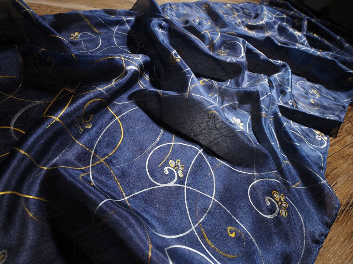 Ručně malovaný šál z přírodního hedvábí (pongé 5). Použití kvalitních barev a tepelné fixace zaručuje dlouhodobou odolnost při opakovaném praní. Snadno se žehlí.