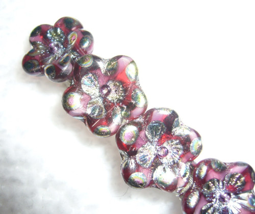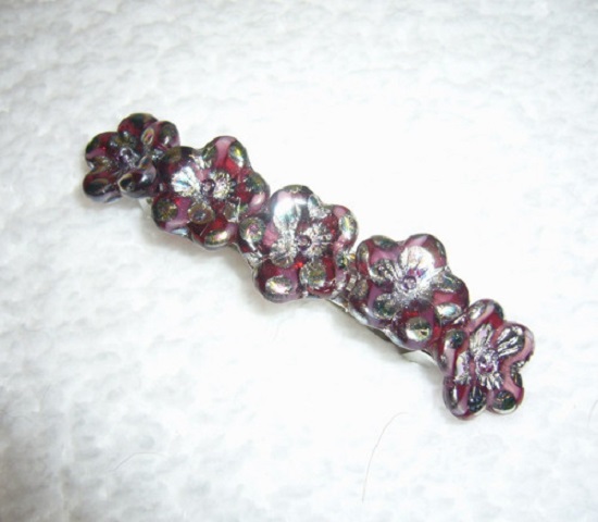 Spona je zdobená vínově červenými korálky ve tvaru kytek.