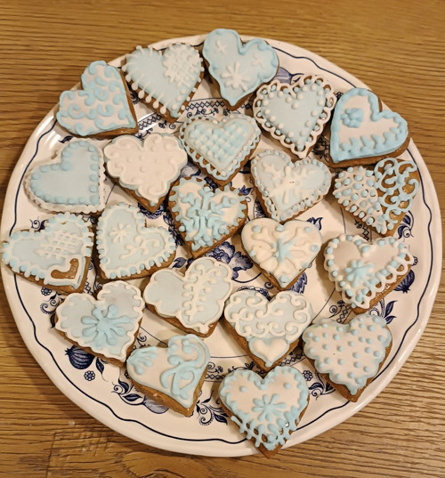 Dekorační srdíčka zdobené cukrovo - bílkovou polevou, vonící perníkovým kořením. Velikost 4.5 cm.