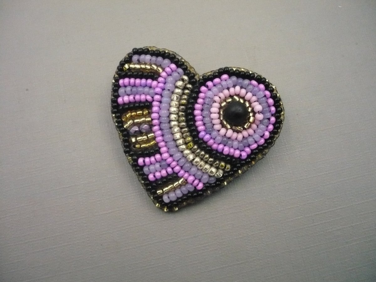 Ručně vyšívaná brož technikou beadweaving. Je pošita rokajlem, vše je podloženo fialovou plstí, na zadní straně je brožový špendlík s pojistkou. Rozměry 49 x 43 mm.