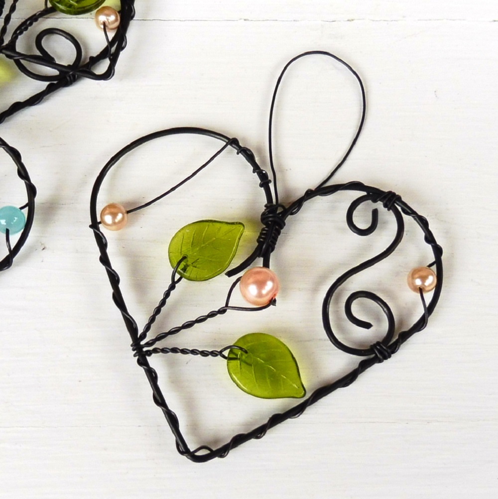 Drátované srdíčko se skleněnými lístečky a korálky.