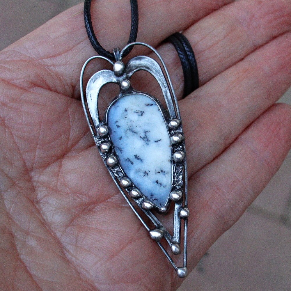 Dendritický opál je fascinující přírodní drahokam, často bílý či hnědý, proslulý svými černými nebo hnědými vzory připomínajícími kapradiny, stromy či keře, které vznikají krystalizací manganu či železa a jsou mylně považovány za zkamenělé mechy. Je ceněn jako „kámen hojnosti" a oblíbený ve šperkařství pro své jedinečné krajinné vzory.