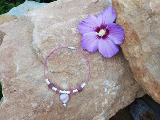Náramek zdobí drobné,ale i větší skleněné korálky a skleněné srdíčko s žíháním.