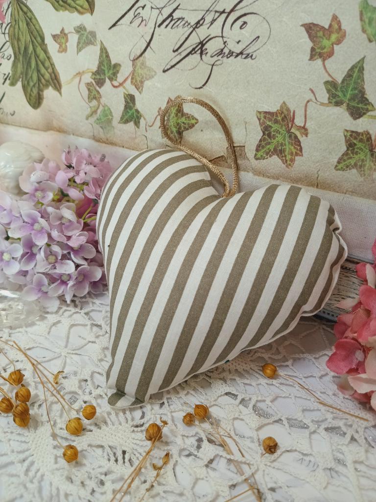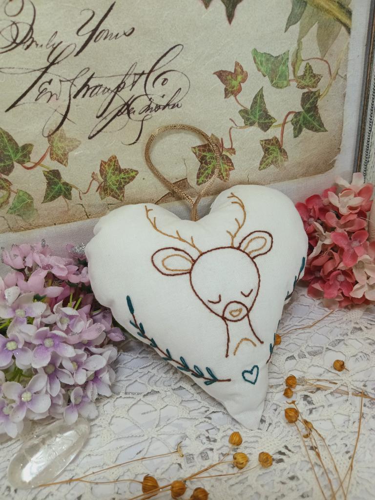 Ručně vyšívané srdíčko s motivem srnečka ve chojí a pruhů na zadní straně. Srdíčko je plněné dutým vláknem a sáčkem s levandulí (lékařské kvality). Srdce je vhodné jako dárek, je možné ho zavěsit, přidat do dekorací, do věnce, nebo jen tak volně položené, také je možné zavěsit na postýlku, pro lepší spánek a zklidnění.