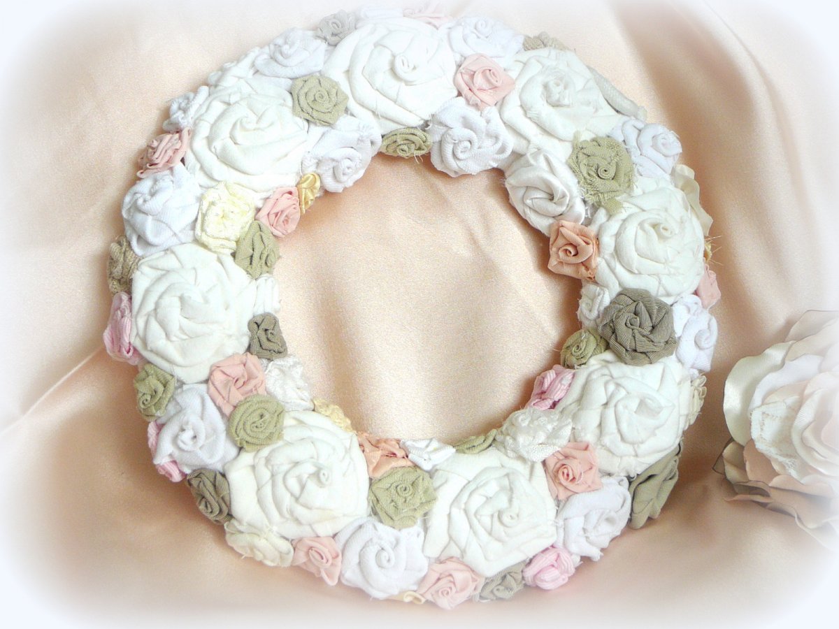 Věneček ve starobylém stylu vyrobený z barevných ručně šitých růžiček .