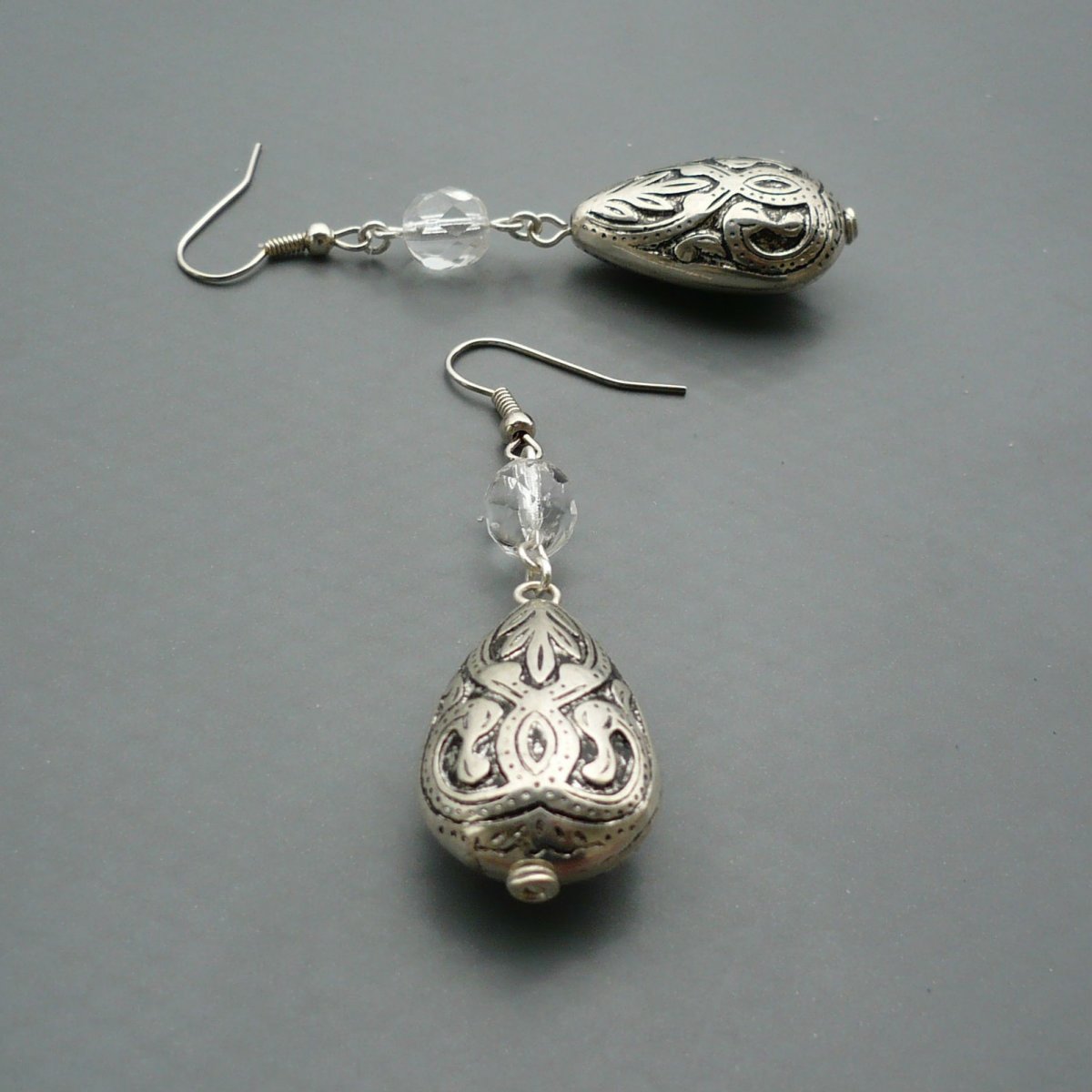 Náušnice tvoří velká spodní kapka starostříbrné barvy s rýhovanými ornamenty. V horní části je čirý broušený skleněný korálek.