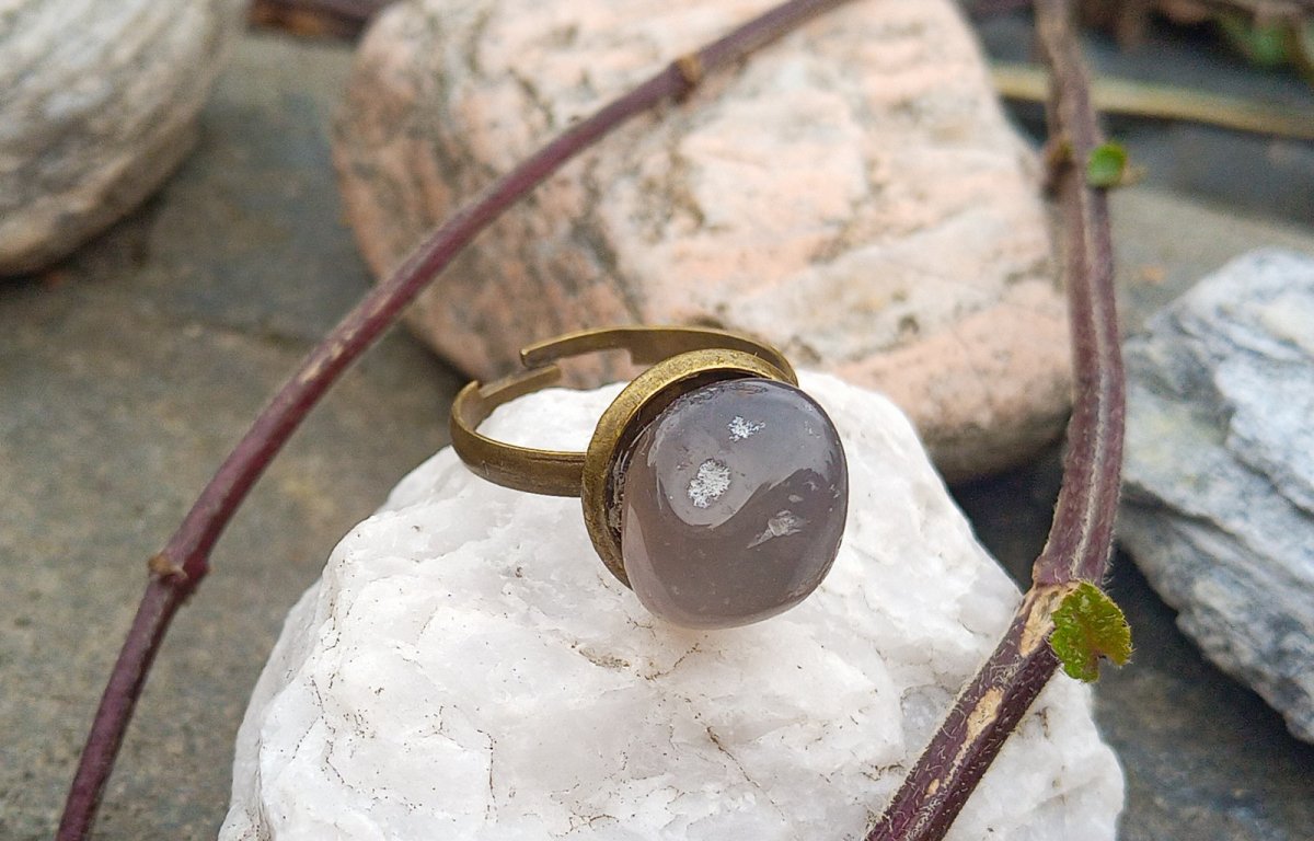 Prstýnek z nerezové oceli ve starozlaté barvě s vloženým tromlovaným kamenem - šedý achát o velikosti cca 15x15x5 mm. Kroužek je z nerezové oceli je velikostně nastavitelný = pro všechny velikosti.