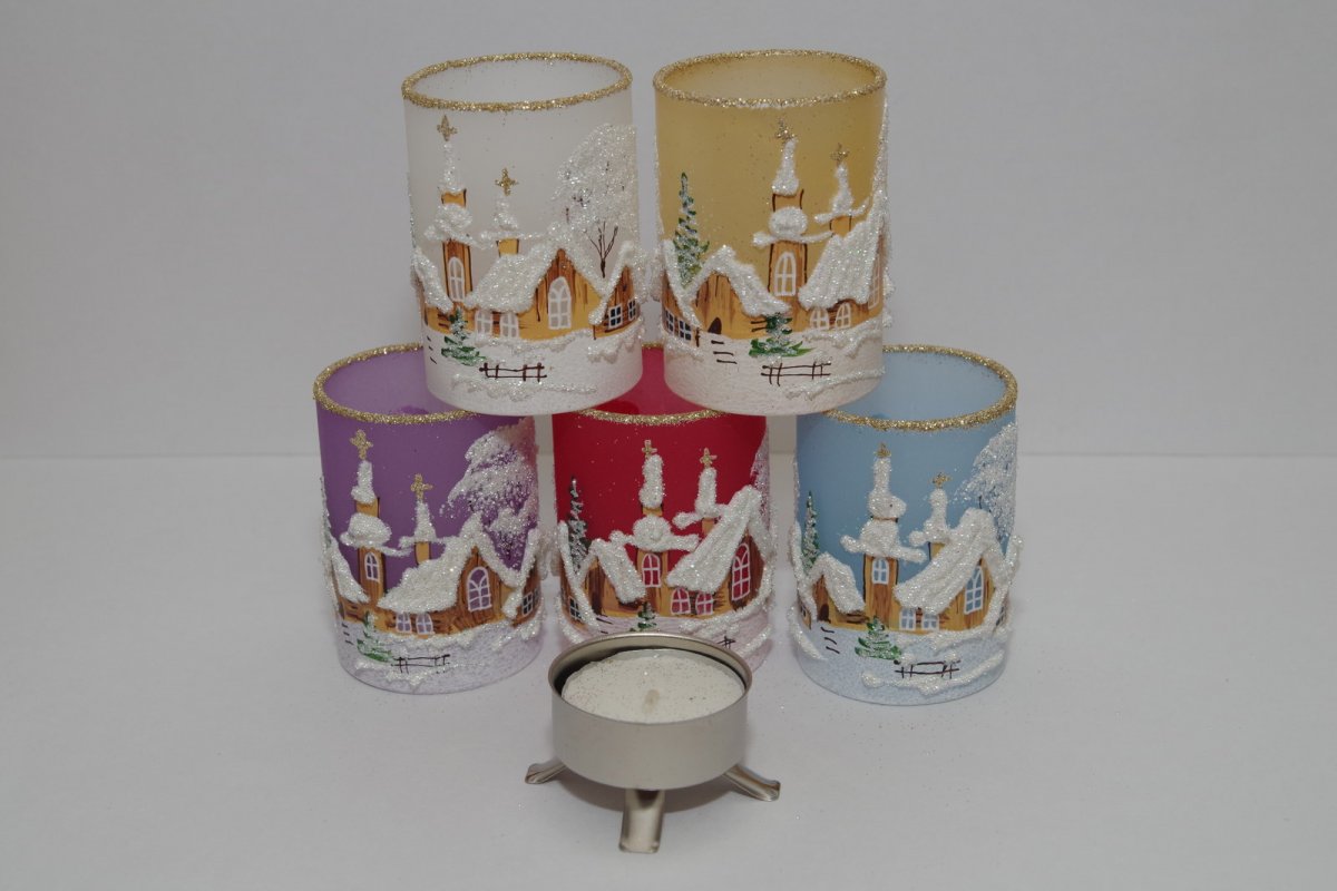 Dekorativní svícen s kovovou podstavou, do které se vkládá čajová svíčka. Svíčka je součástí balení.Dělá krásný průsvitný efekt v okýnkách malby.