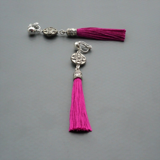 Efektní klipsové náušnice jsou tvořeny horním plochým pokoveným ozdobným korálkem starostříbrné barvy a pod ním je umístěný fuchsiově růžový střapeček.