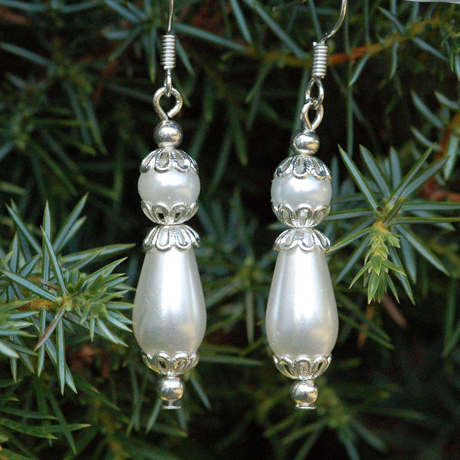 voskované korálky, kovové koponenty v barvě stříbra. Délka bez háčků 3 cm.