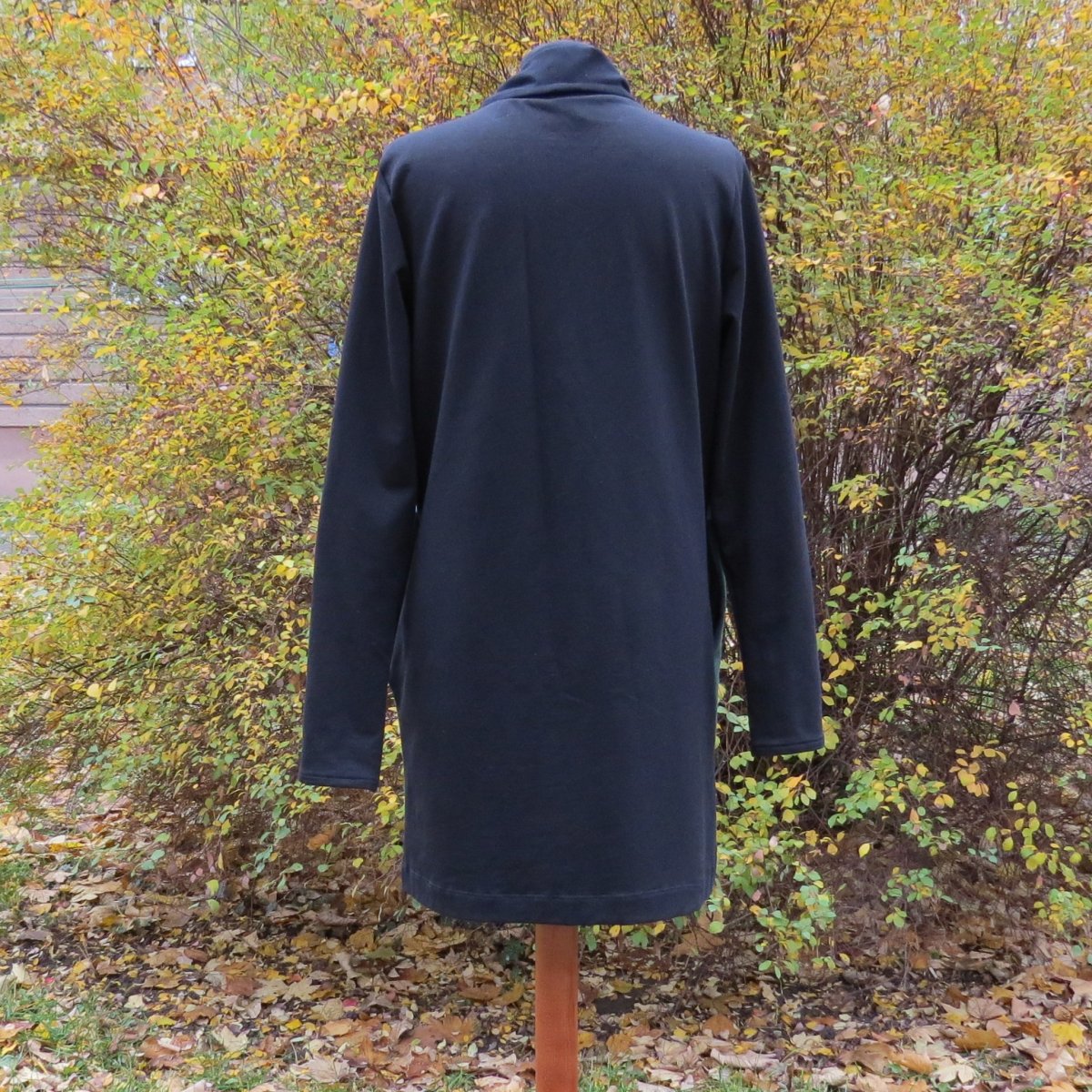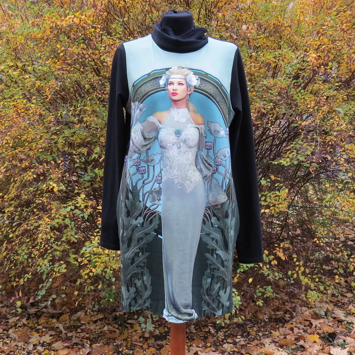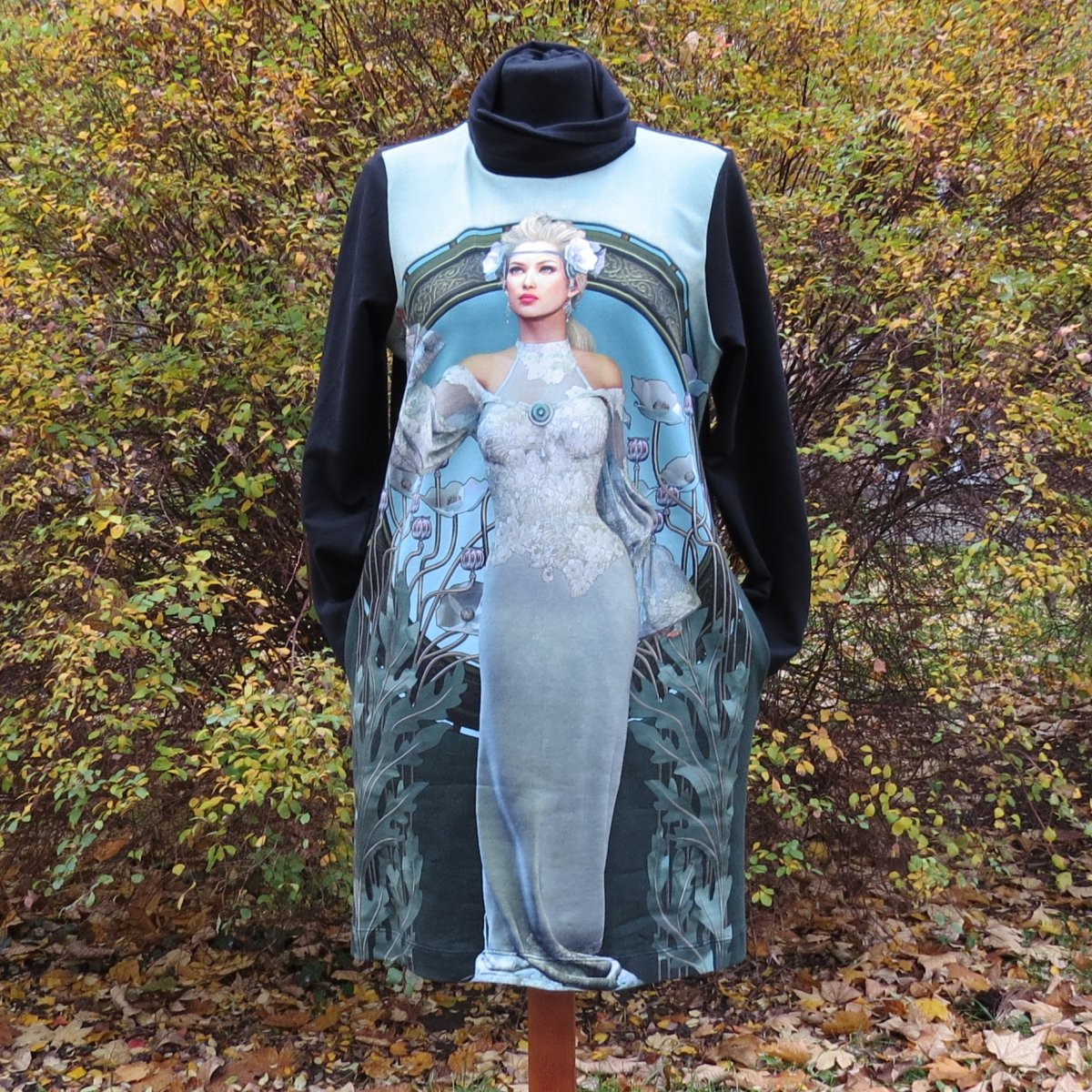 Mikinošaty v kombinaci dvou látek - pření díl je z látky s motivem ženy v bílém, záda a rukávy jsou černé. U krku jsou zakončené překříženým stojáčkem. V bočních švech mají kapsy. Jsou ušité z nepočesané bavlněné teplákoviny s elastanem.