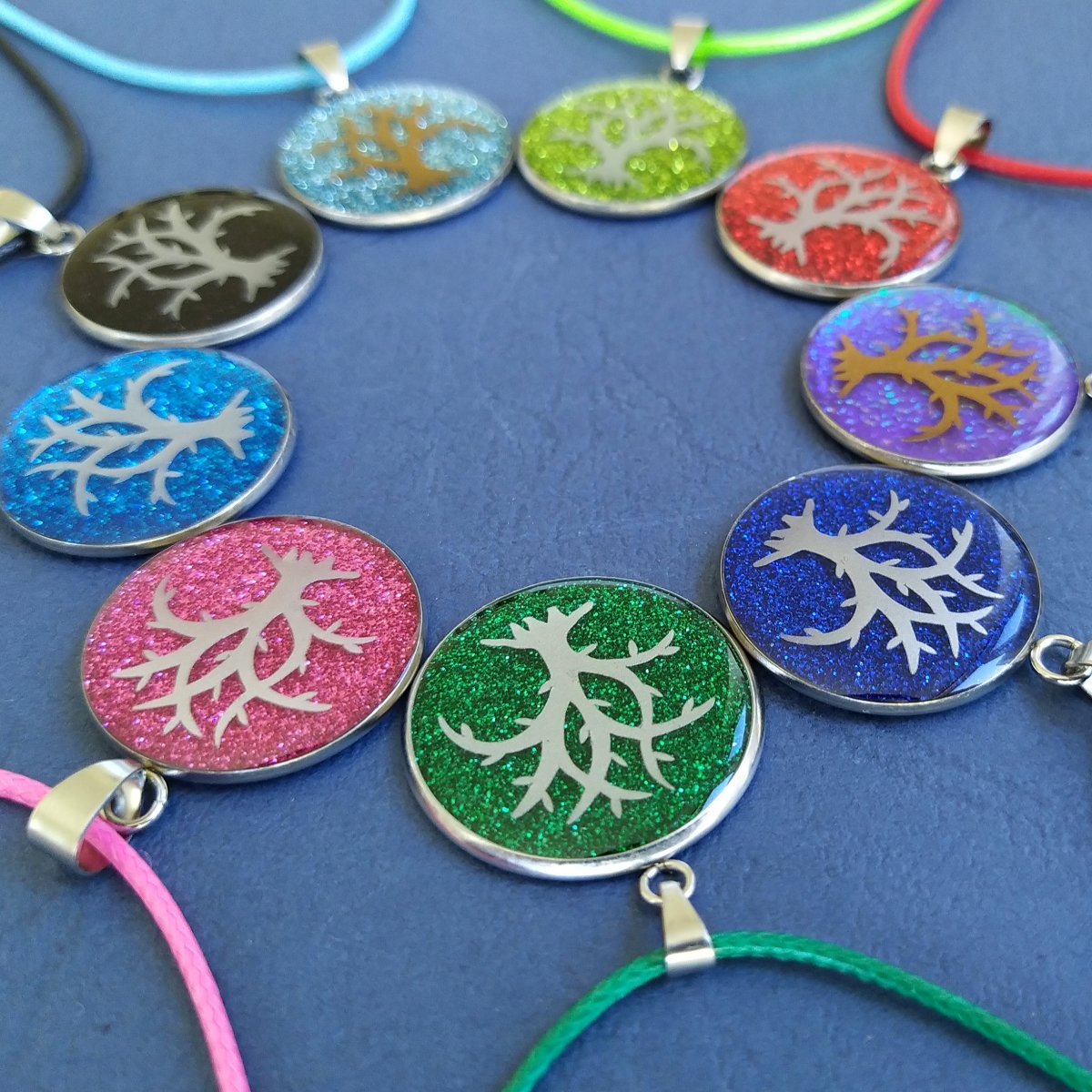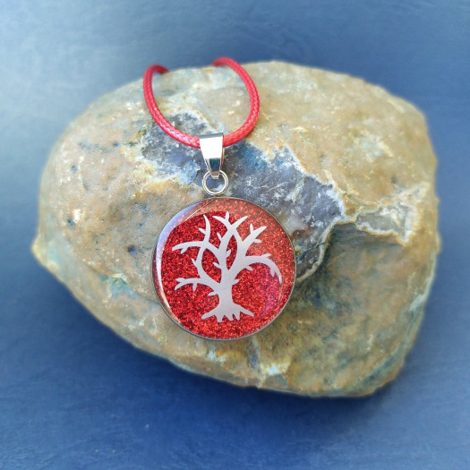 Přívěšek z chirurgické oceli, vnitřní průměr 2,5 cm s motivem Strom života stříbrné barvy na třpitivém podkladu červené barvy. Přívěšek je navlečen na voskované bavlněné šňůrce (náhodné barvy), která je povrchově ošetřená voskováním.