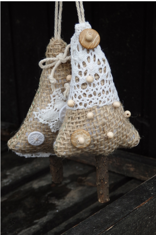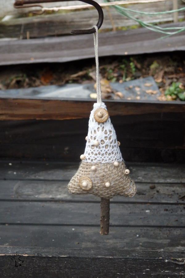 Adventní dekorace - stromeček - je ušitý z juty a dozdobený krajkou, bavlněným provázkem a dřevěnými a kokosovými korálky. Výplň tvoří duté vlákno a několik snítek levandule.