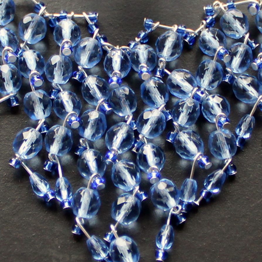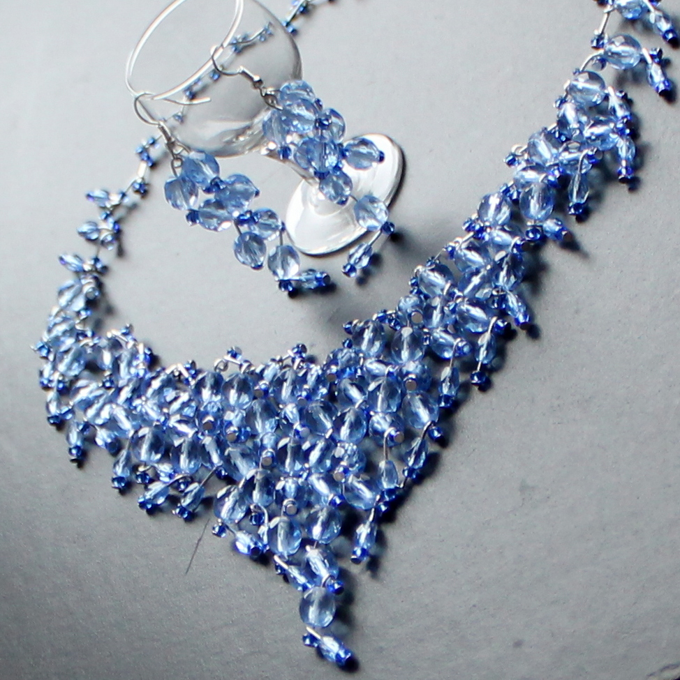 Bohatý a velmi zdobný náhrdelník a náušnice z ohňových korálkůů a rokajlu v odstínech studené modré.