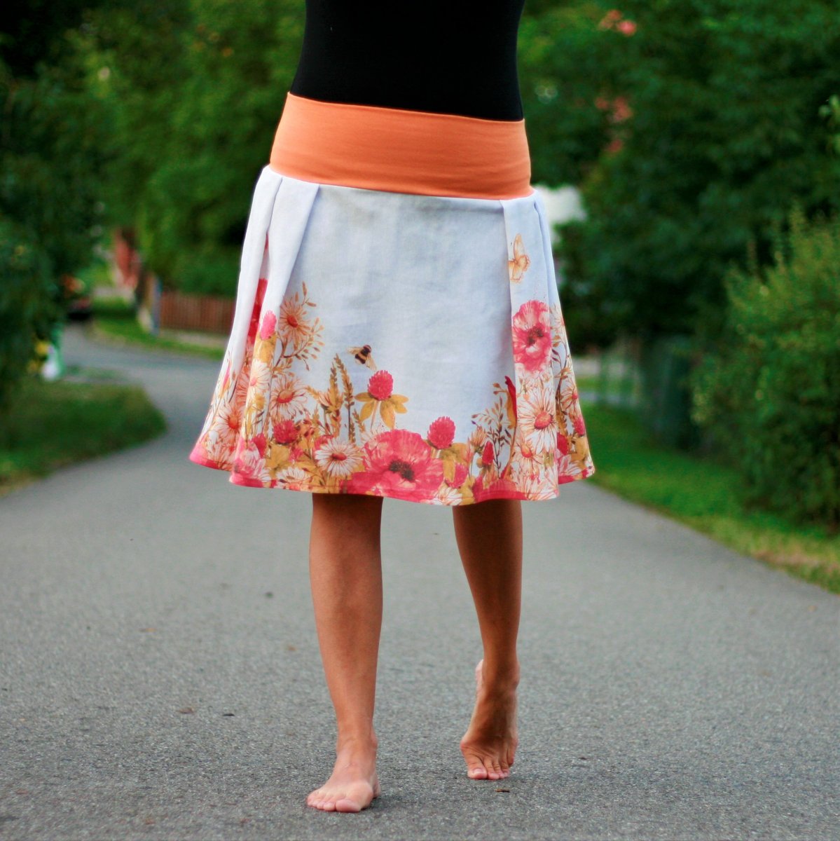 Sukně je v pase všitá do úpletu, přizpůsobí se postavě, je jednoduchá, přitom krásná. V pase jsou menší sklady, které nevytvářejí až tak velký objem sukně, jak je tomu třeba u sukní kolových.
