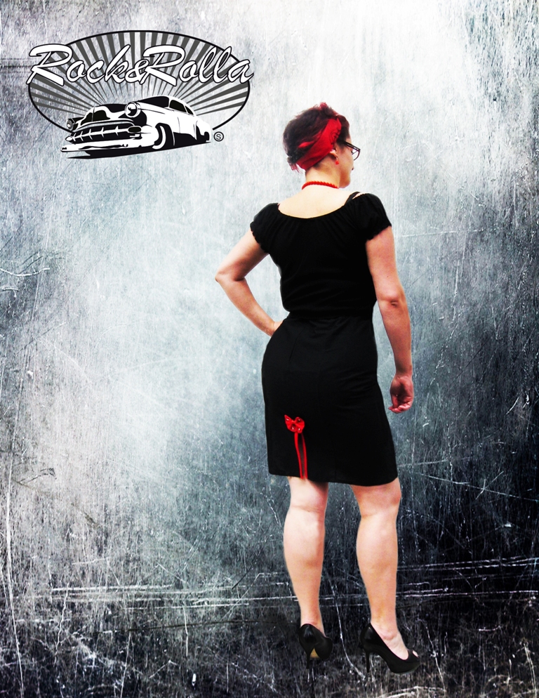 Pouzdrová sukně s rozparkem, aplikací vlaštovek a červenými knoflíky.