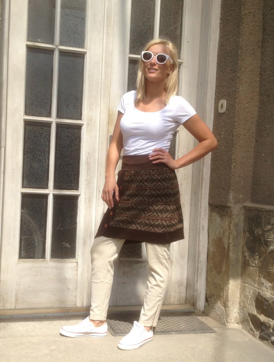 Trendy sukně jsou ušity v kombinaci různých pletenin, s teplákovinou, balónovinou a rilflovinou.
