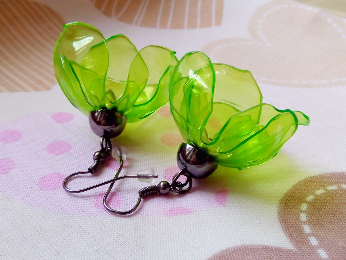 Ručně vyrobeno dle vlastního návrhu z recyklovaných PET lahví a bižuterních komponentů.