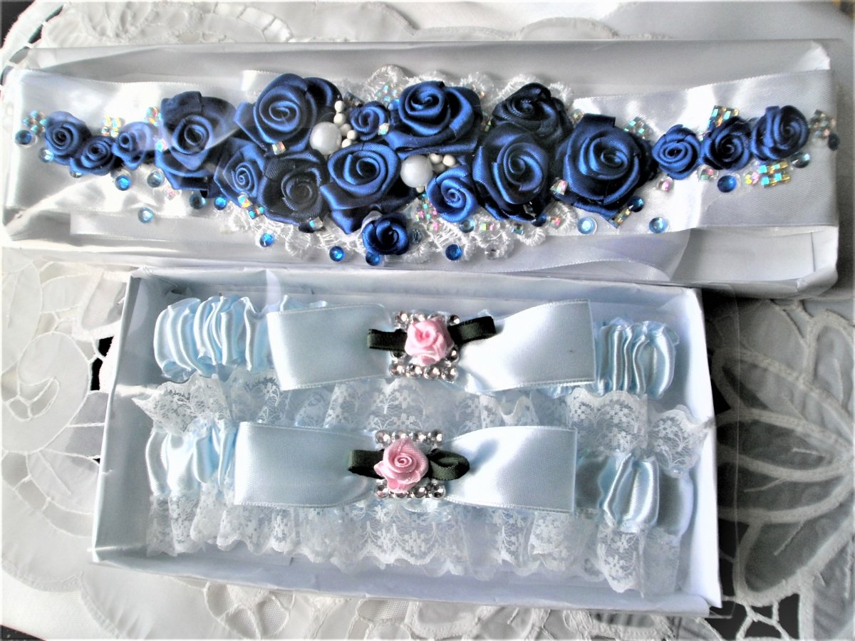 Modrá saténová časť podväzku je zdobená so štrasovou štvorcovou brošničkou,zeleňou , ružičkou a s čipkou. Svadobný podväzok sa môže využiť pri veselých spestreniach svadby, ako hádzanie podväzku medzi slobodných mládencov , ako aj nevesta svoju kyticu.